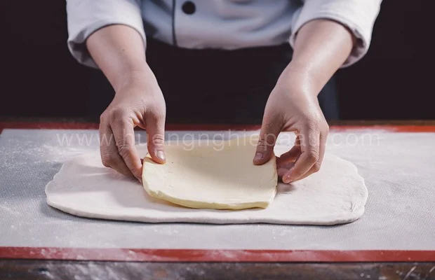 Tiếp theo, cán bột thành miếng mỏng từ 2 – 4mm. Tùy theo ý thích bạn có thể cán miếng bột to hoặc chia thành từng miếng nhỏ để cán theo độ lớn của khuôn bánh. Nếu chia nhỏ thì những phần bột còn lại để trong tủ lạnh, khi nào dùng mới lấy ra.