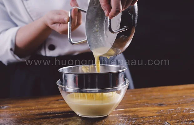 Thêm sữa vào hỗn hợp, trộn lên lần nữa rồi lấy rây lọc qua một lần, cho vào nồi đun trên lửa nhỏ, khuấy đều tay. Khi hỗn hợp sánh lại thì tắt bếp, cho thêm vailla cùng với bơ vào rồi trộn đều, cho ra bát để nguội.