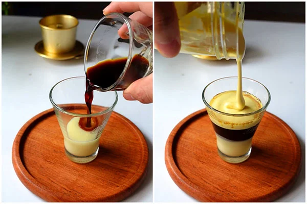 Khi đã chuẩn bị xong phần cà phê và kem trứng, bạn tiến hành pha cà phê trứng. Trước hết, cho 4 thìa sữa đặc vào ly, lượng sữa đặc có thể gia giảm tùy theo khẩu vị. Sau đó rót cà phê đen vào rồi đổ từ từ phần kem trứng lên trên. Lúc này, ly cà phê sẽ tạo thành 3 tầng màu sắc đẹp mắt.
