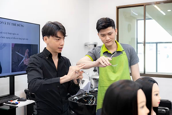 Học viên trực tiếp thực hành các kỹ thuật cắt tóc nam trong môi trường đào tạo chuyên nghiệp. Từ thao tác cơ bản đến nâng cao như fade, undercut, side part…, tất cả đều được hướng dẫn bài bản từ giảng viên.