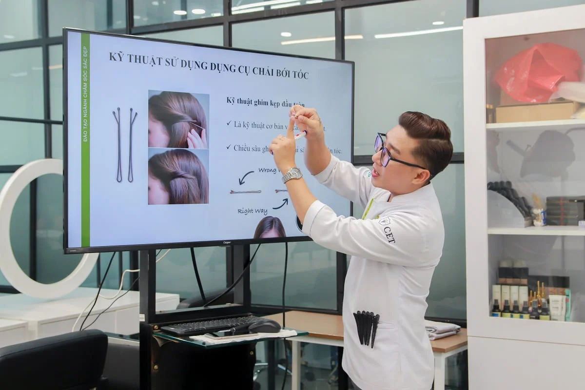 Giảng viên là những chuyên gia có kinh nghiệm thực tiễn lâu năm, luôn đồng hành chỉnh tay, sửa dáng và truyền đạt mẹo xử lý tóc chuyên nghiệp. Học viên được thực hành liên tục trên mẫu thật và mannequin, từ đó rèn tay nghề nhanh chóng và tự tin hành nghề sau khóa học.