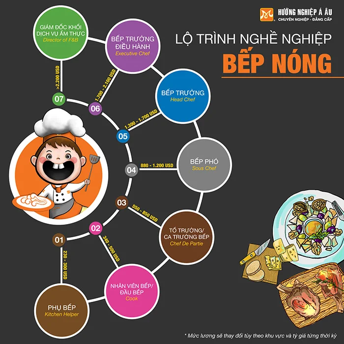 Ngoài ra, học nghề bếp rất dễ có cơ hội du học, thực tập hưởng lương và làm việc tại nước ngoài (đặc biệt là Úc, Canada, Mỹ, Nhật Bản, Trung Quốc, Philippines…) với mức lương luôn đứng top các ngành nghề có thu nhập cao.