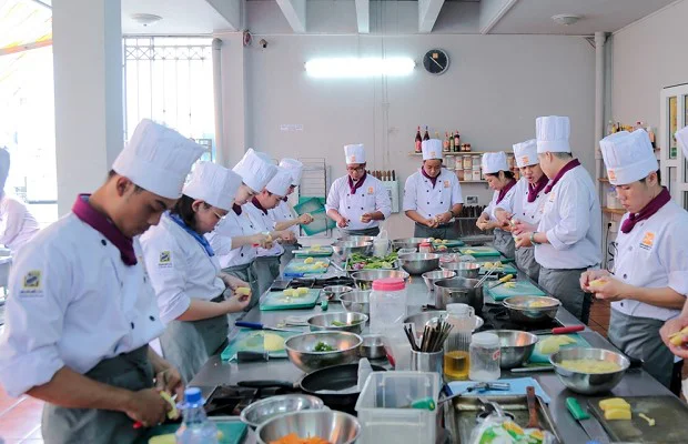 Phòng thực hành là khu bếp 1 chiều mô phỏng giống với thực tế tại các nhà hàng, khách sạn. Điều này giúp học viên không bị bỡ ngỡ, nhanh chóng hòa nhập vào môi trường làm việc sau tốt nghiệp.
