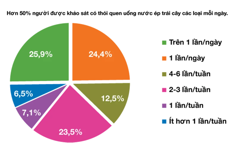 Đáng chú ý là hơn một nửa số người được khảo sát có thói quen uống nước ép trái cây mỗi ngày. Điều này cho thấy người tiêu dùng ngày càng quan tâm đến vấn đề sức khỏe. Nếu bạn đang có ý định chen chân vào thị trường đồ uống thì nước ép trái cây sẽ là một thị trường vô cùng tiềm năng để phát triển và thu nhiều lợi nhuận chỉ trong thời gian ngắn.