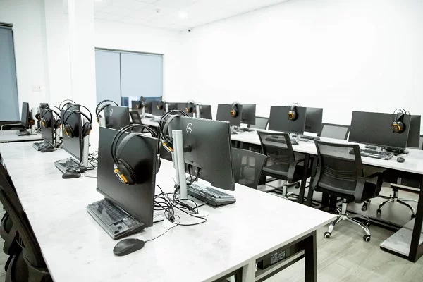 Phòng học thực hành được trang bị đầy đủ thiết bị máy tính, tivi, màn hình chiếu hiện đại giúp học viên theo dõi bài giảng trực quan và thực hành ngay tại lớp.