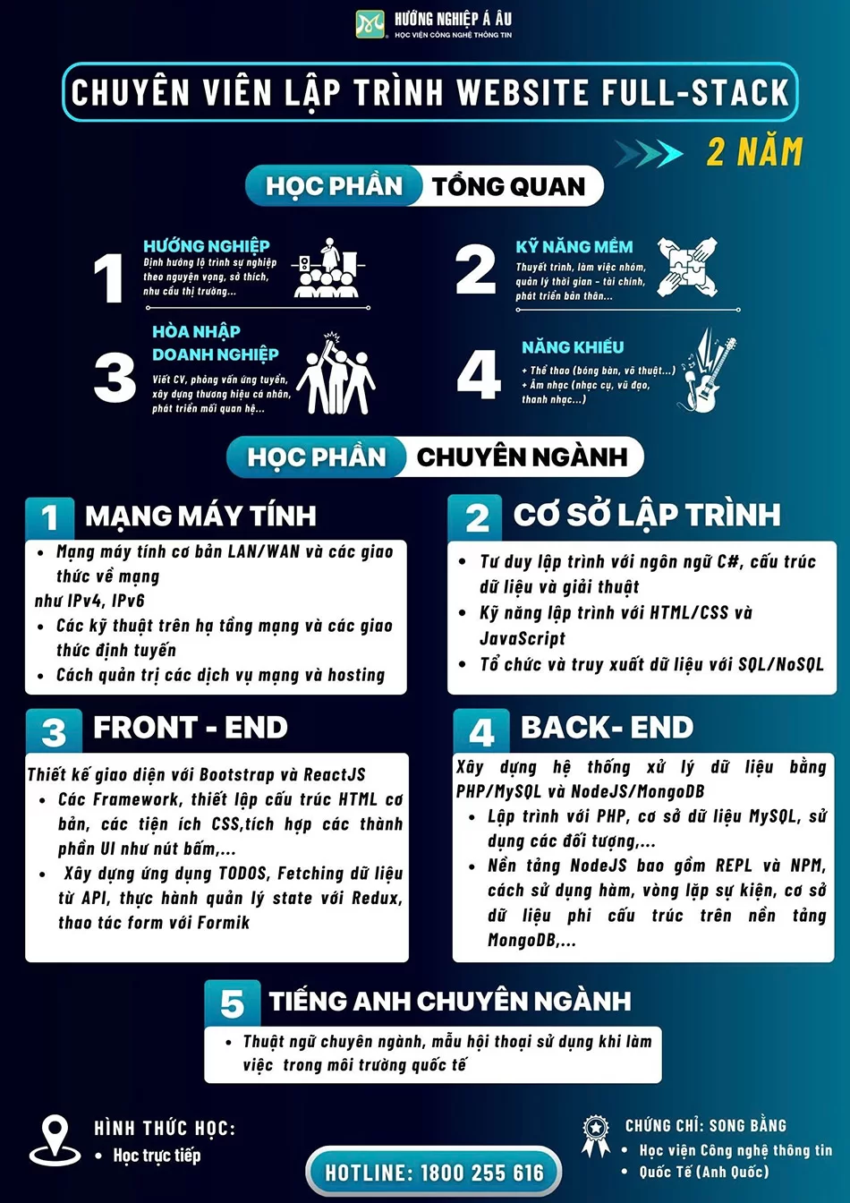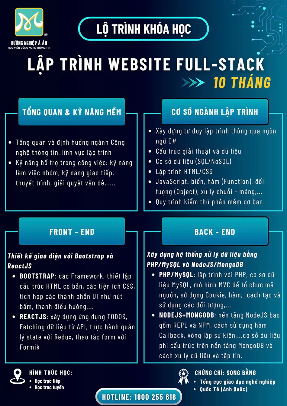 Lớp học lập trình web (Full Stack) tại Học viện Công Nghệ Thông Tin – Hướng Nghiệp Á Âu sẽ cung cấp cho bạn 1 lộ trình học cách lập trình trang web từ cơ bản đến nâng cao dưới sự hướng dẫn của các chuyên gia hàng đầu trong lĩnh vực.