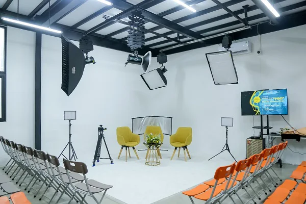 Phòng thực hành được thiết kế như một studio chuyên nghiệp với đầy đủ các thiết bị như phông nền, đèn chiếu, các công cụ dụng cụ như Barndoor, Gobo, tấm phản quang… Hệ thống máy tính có cấu hình mạnh, được cài sẵn những phần mềm hỗ trợ làm phim thông dụng như Photoshop, Premiere, Illustrator… giúp học viên edit video một cách nhanh chóng.
