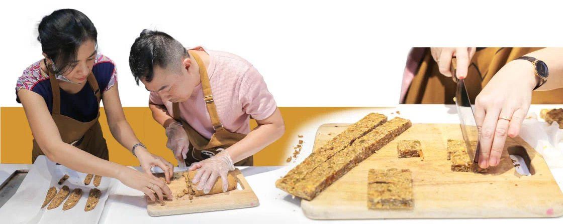 Mùi thơm nhanh chóng lan tỏa khăn căn bếp, mẻ bánh đầu tiên thành công rực rỡ và lần lượt các mẻ bánh tiếp theo cũng ra lò trong niềm vui sướng của cả lớp. Giảng viên hướng dẫn các bạn trang trí, ôn lại các kiến thức cũ, mở rộng cách biến tấu hương vị và hướng dẫn bảo quản. Sau đó, học viên cùng thưởng thức bánh, đưa ra nhận xét của mình và trao đổi cùng nhau.