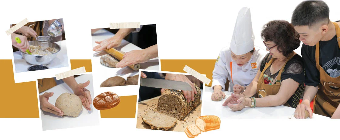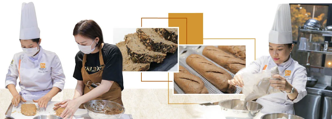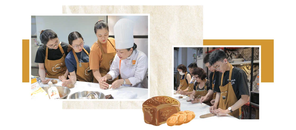 Bột sau khi trộn xong sẽ được ủ, fold lại, tạo hình và nướng. Ở mỗi giai đoạn của từng món bánh, Giảng viên đều chỉ dẫn từng thao tác, lồng ghép các bí quyết như: Cách kiểm tra bột, hướng dẫn kỹ thuật fold, thời gian và điều kiện thích hợp để ủ bột, phương pháp tạo hình bánh và kỹ thuật nướng… Học viên vừa quan sát Giảng viên hướng dẫn vừa chia thành các nhóm nhỏ để thực hành. Giảng viên luôn theo sát và giúp học viên khắc phục lỗi sai, lồng ghép với việc giải đáp thắc mắc để học viên nắm chắc bài ngay tại lớp.
