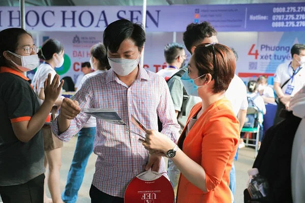 Tại ngày hội, phụ huynh và học sinh được chia sẻ những thông tin bổ ích từ chuyên viên tư vấn